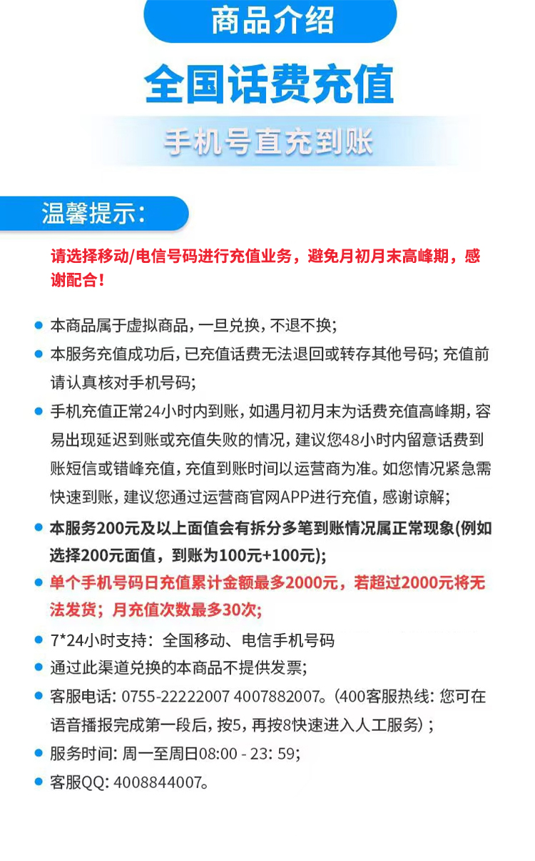 本商品不支持联通号码充值。虚拟商品,一旦兑换,不退不换。请填写正确的充值账号,一经发货无法退改。